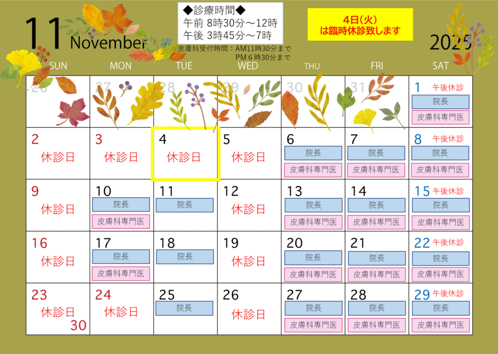 | 院長 | 月 | 火 | 水 | 木 | 金 | 土 | 日/祝 |