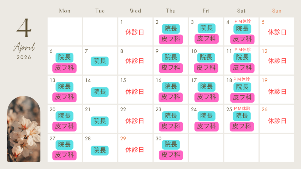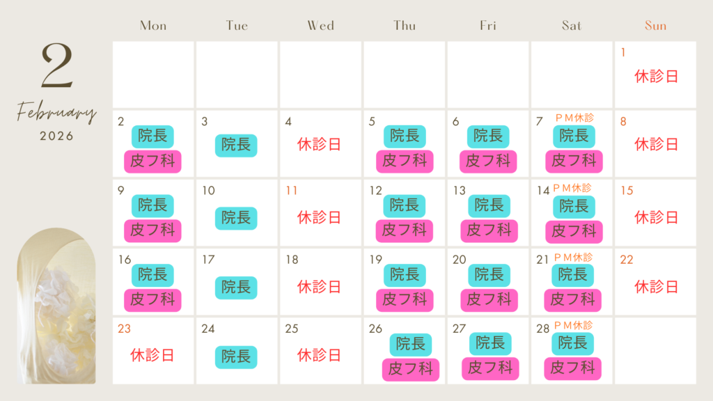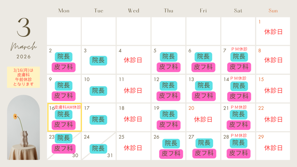 | 皮膚科専門医 | 月 | 火 | 水 | 木 | 金 | 土 | 日/祝 |